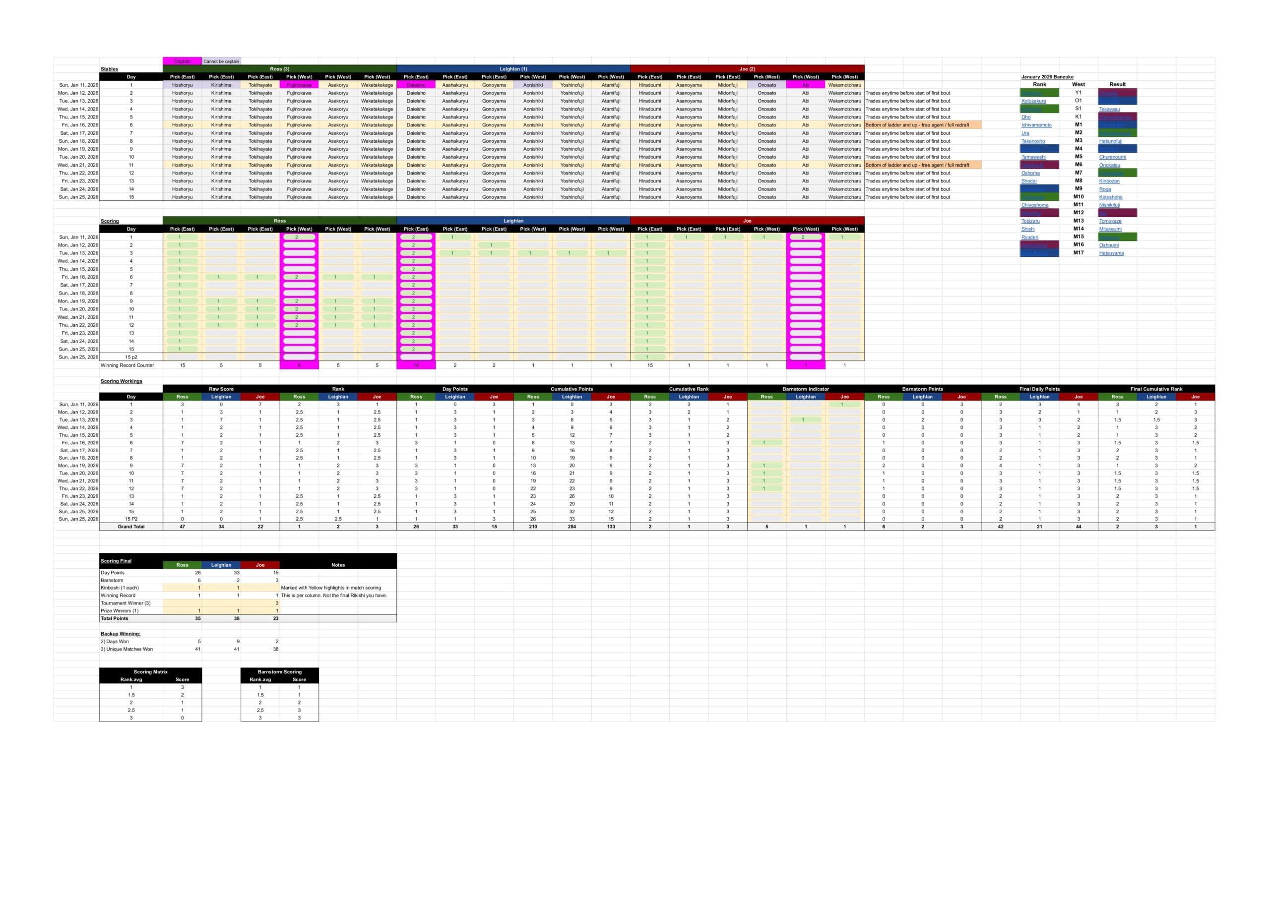 If you’ve played Fantasy Football, you know the drill: you draft a team, track their performance, and pray for no injuries. But Sumo brings its own unique flavor. In our league, we aren’t just fans; we are Oyakata (親方 – Stablemasters) managing a portfolio of six rikishi (力士 – wrestlers). We generally use a name selector [wheelofnames] and the order will be 1,2,3,3,2,1,1,2,3,3,2,1,etc.